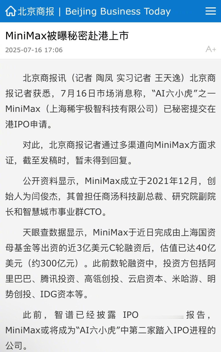 [#MiniMax被曝秘密赴港上市#]@北京商报记者获悉维度配资,7月16日市场消息称,“AI六小虎”之一MiniMax(上海稀宇极智科技有限公司)已秘密提交在港IPO申请。